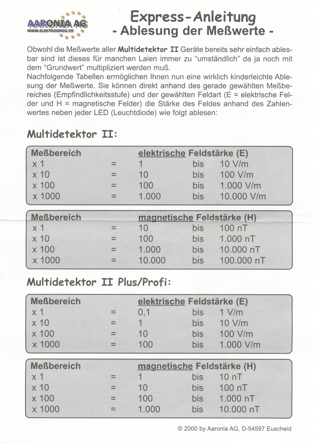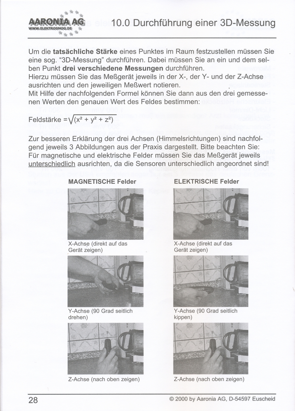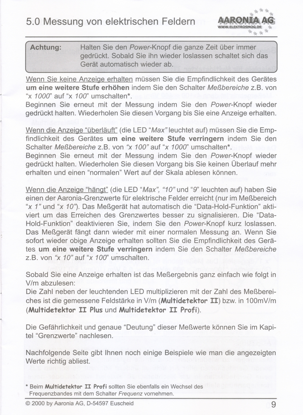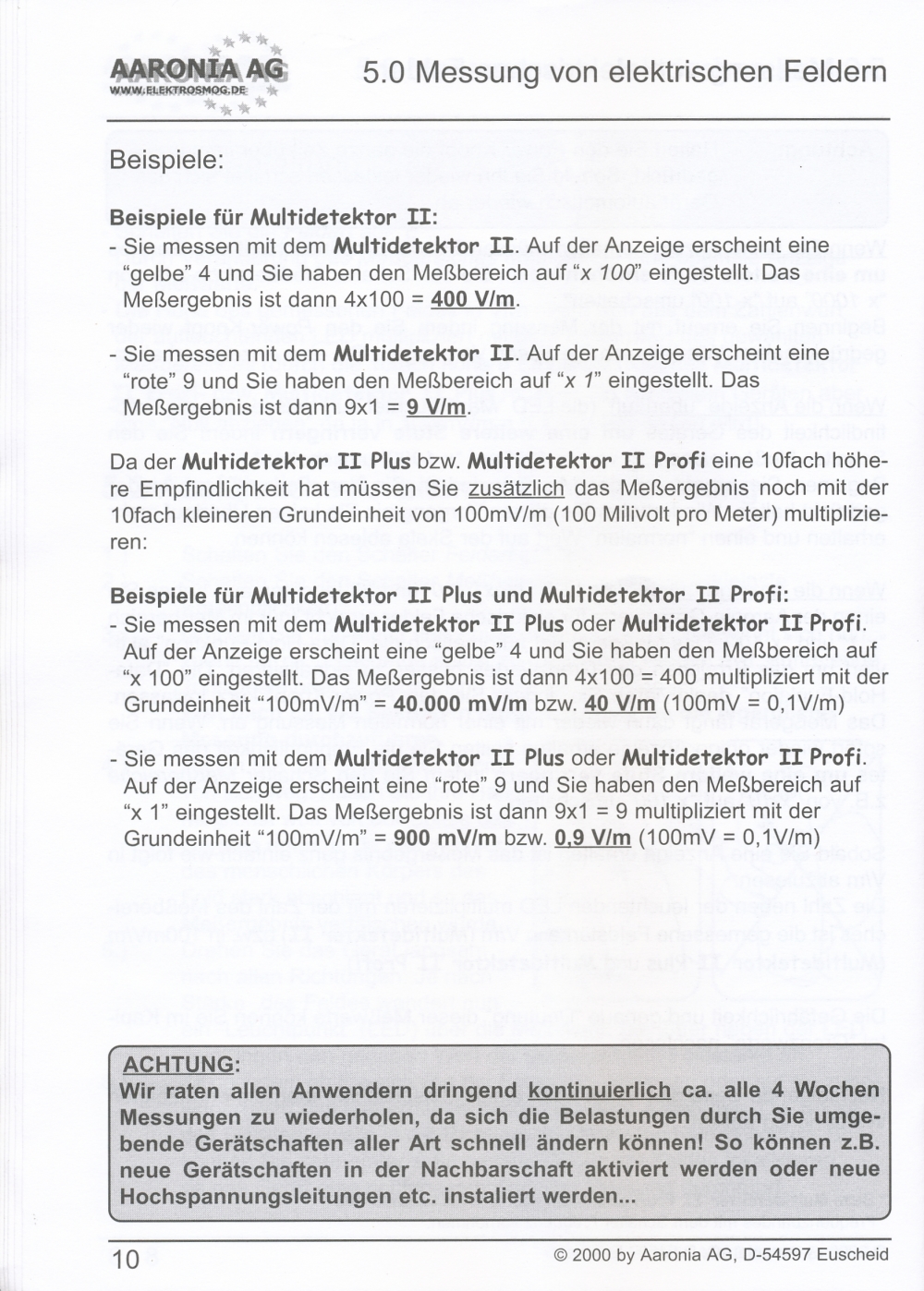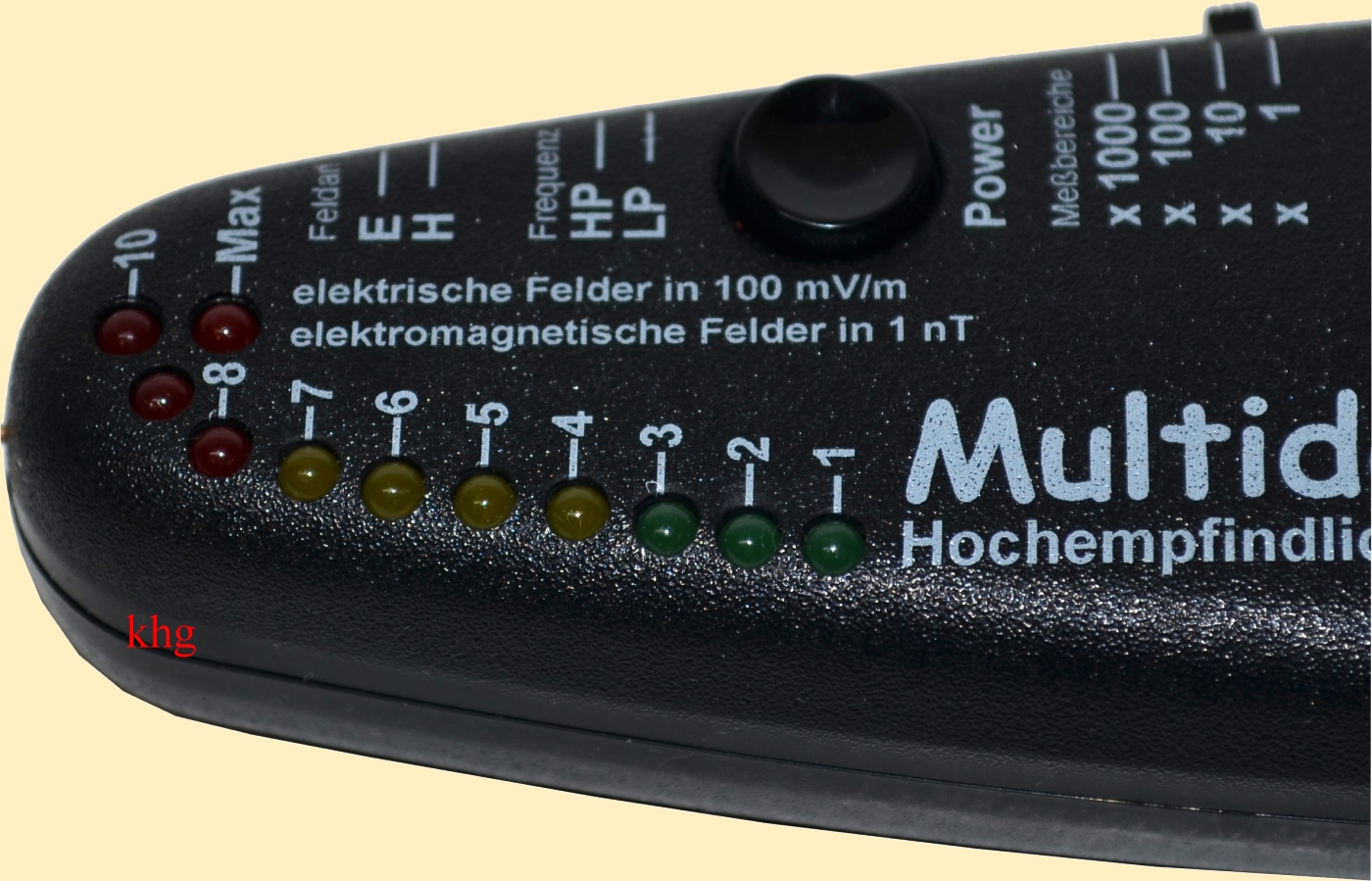 Messung elektrischer Felder in 4 Messbereichen: 0,1-1 V/m; 1-10 V/m; 10-100 V/m; 100-1000 V/m; beste Auflösung: 0,1 V/m;