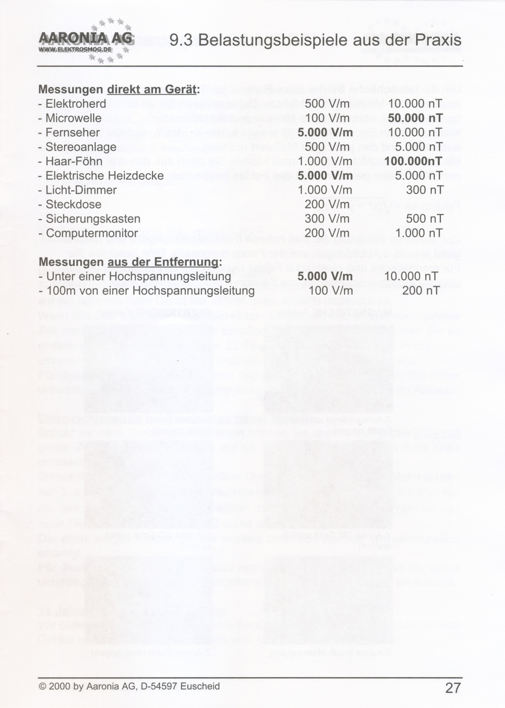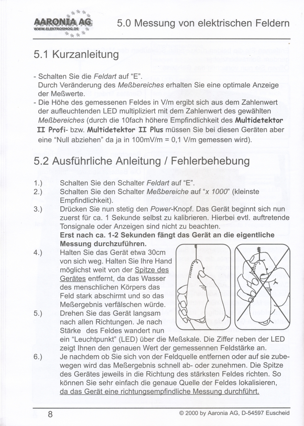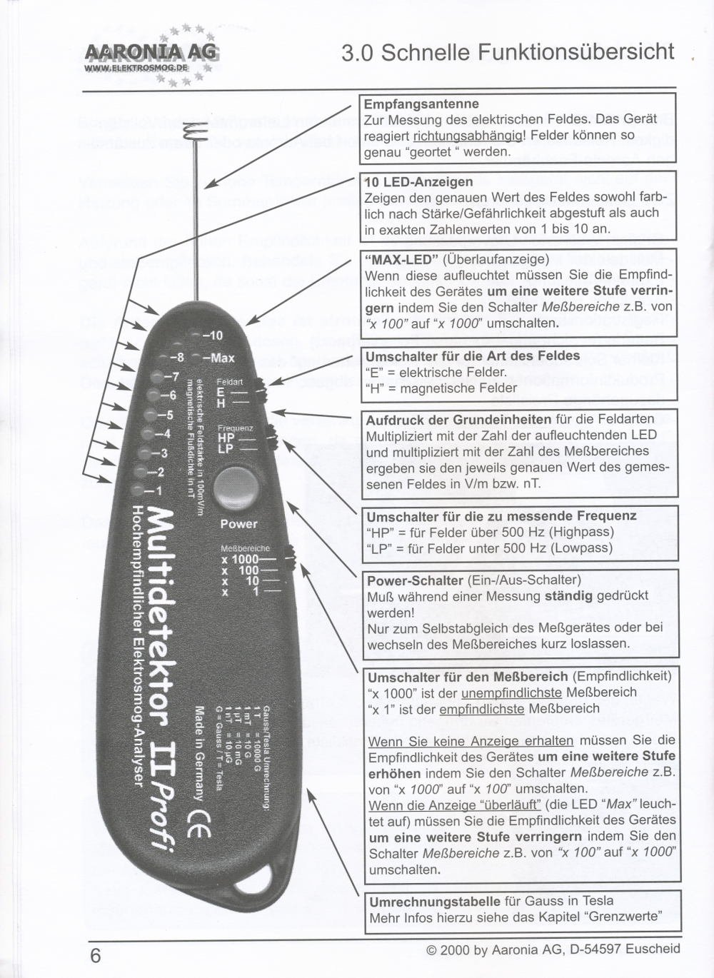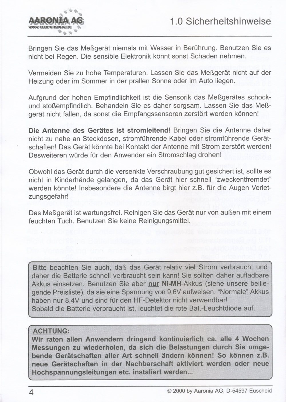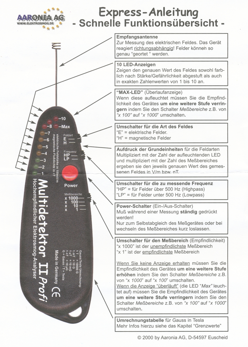 Messung elektrischer Felder in 4 Messbereichen: 0,1-1 V/m; 1-10 V/m; 10-100 V/m; 100-1000 V/m; beste Auflösung: 0,1 V/m;