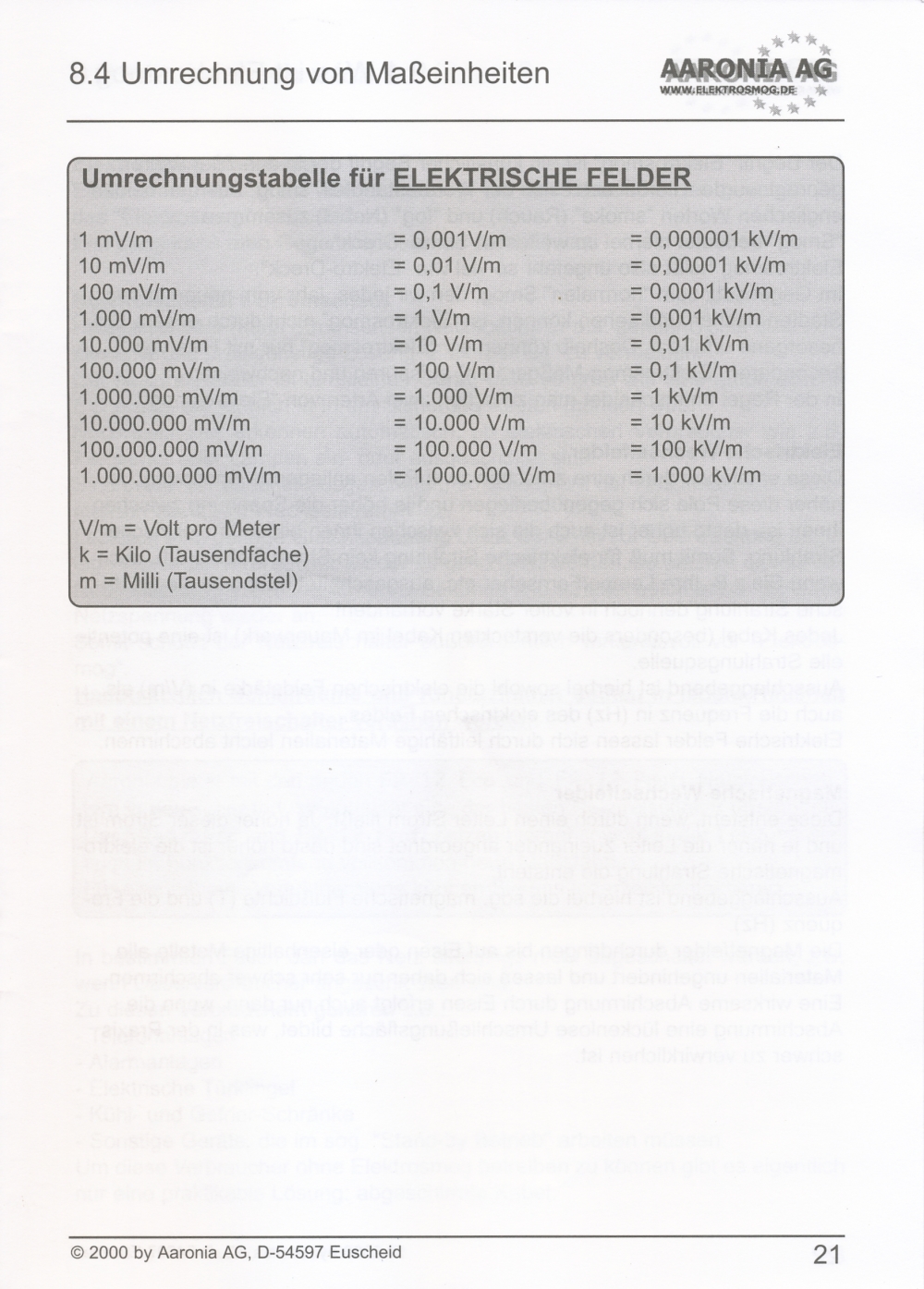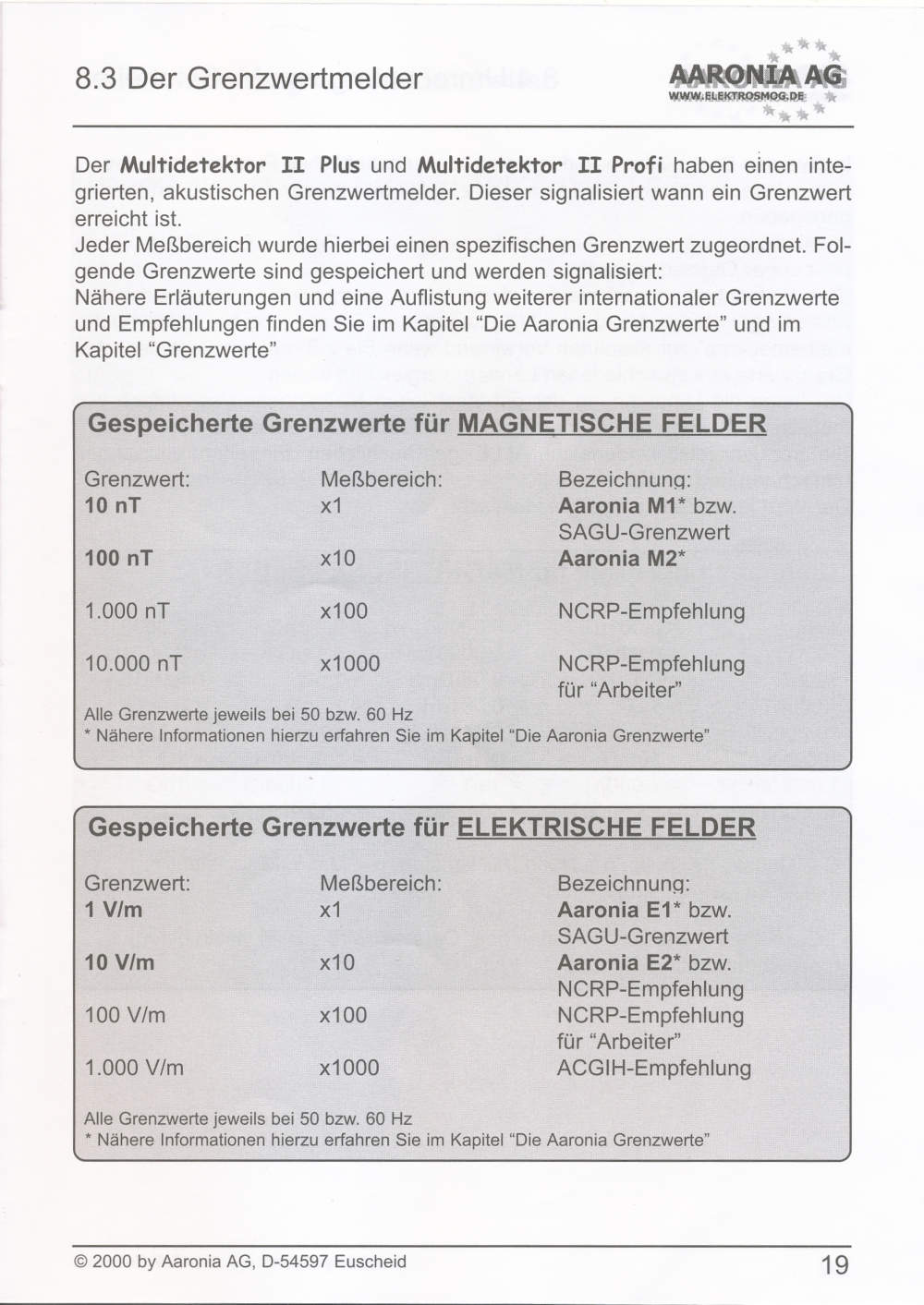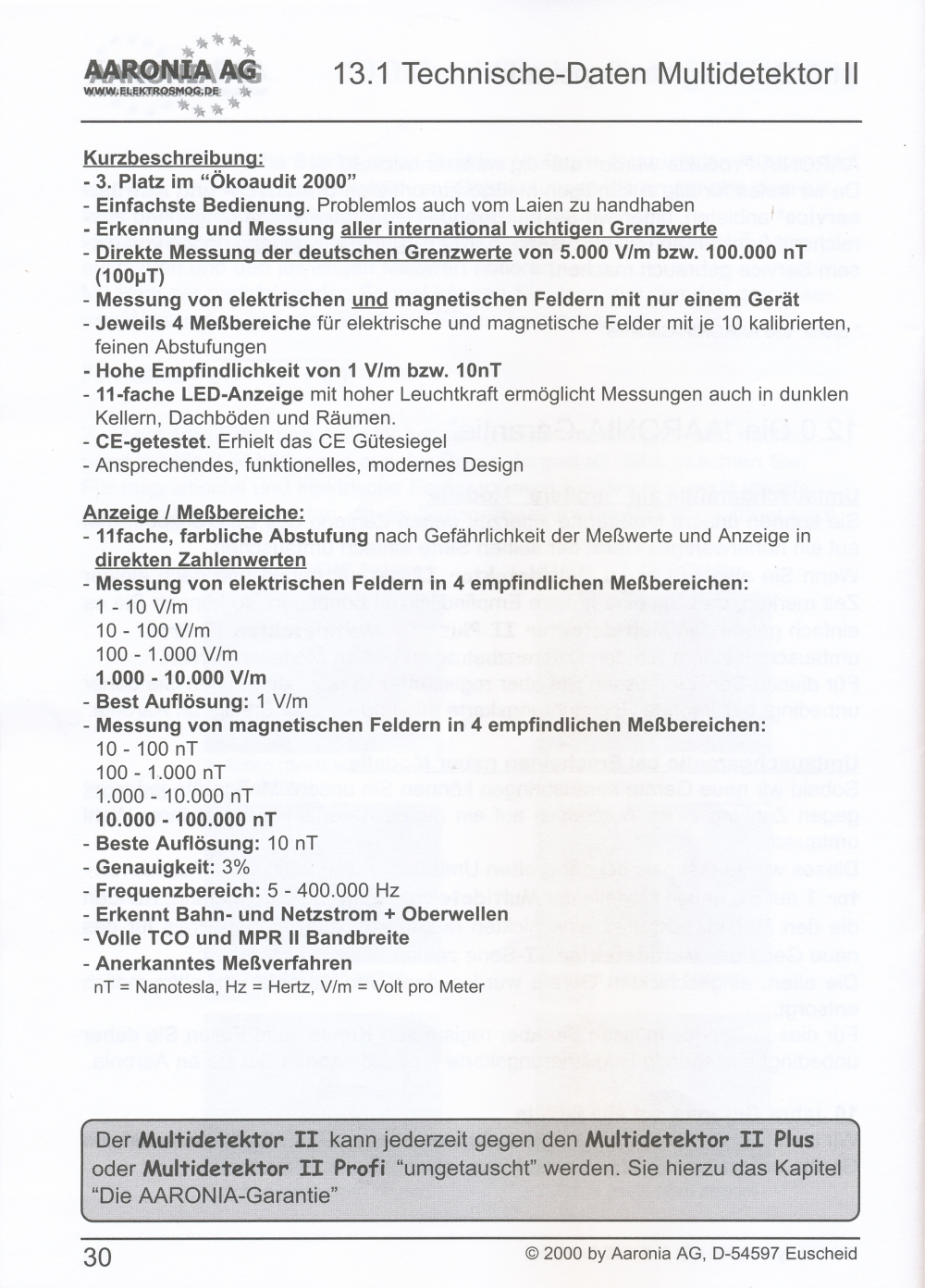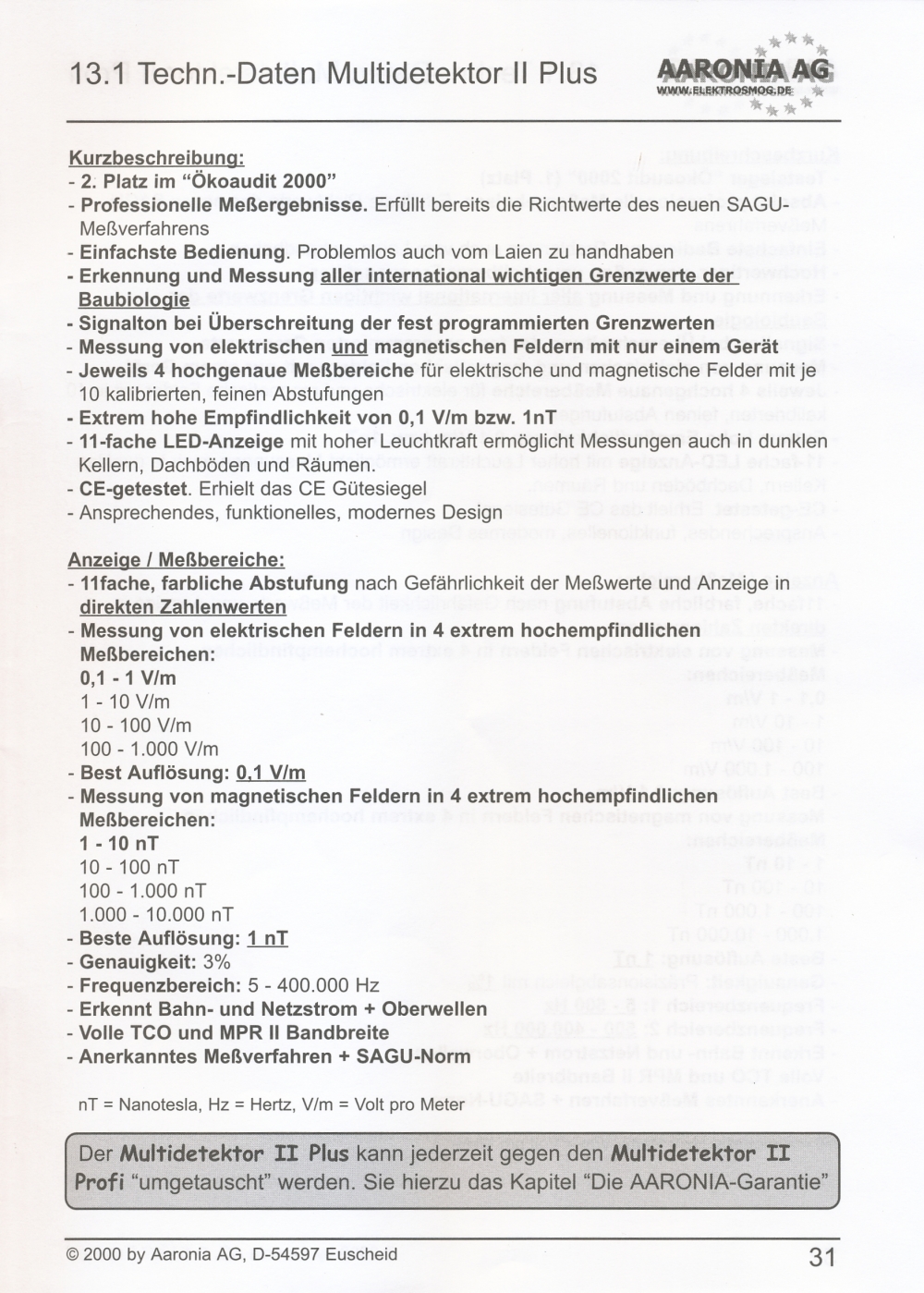 Messung elektrischer Felder in 4 Messbereichen: 0,1-1 V/m; 1-10 V/m; 10-100 V/m; 100-1000 V/m; beste Auflösung: 0,1 V/m;