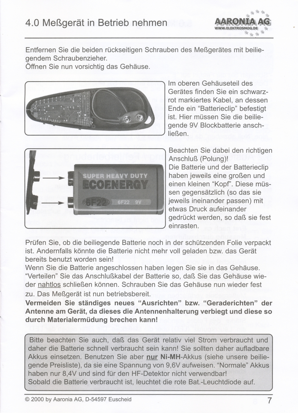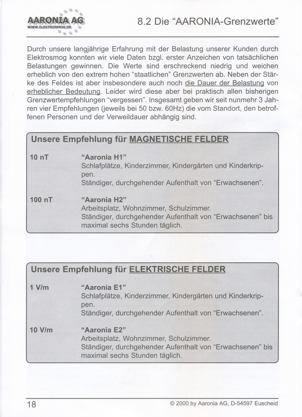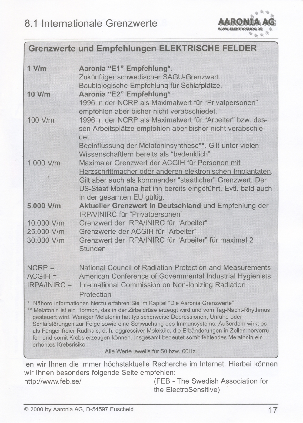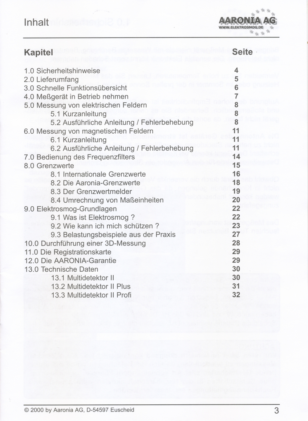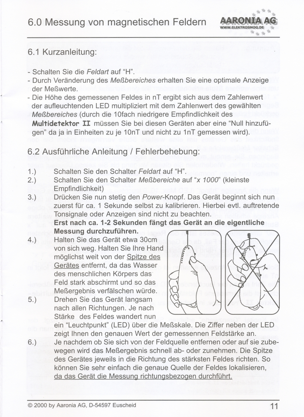 Messung elektrischer Felder in 4 Messbereichen: 0,1-1 V/m; 1-10 V/m; 10-100 V/m; 100-1000 V/m; beste Auflösung: 0,1 V/m;