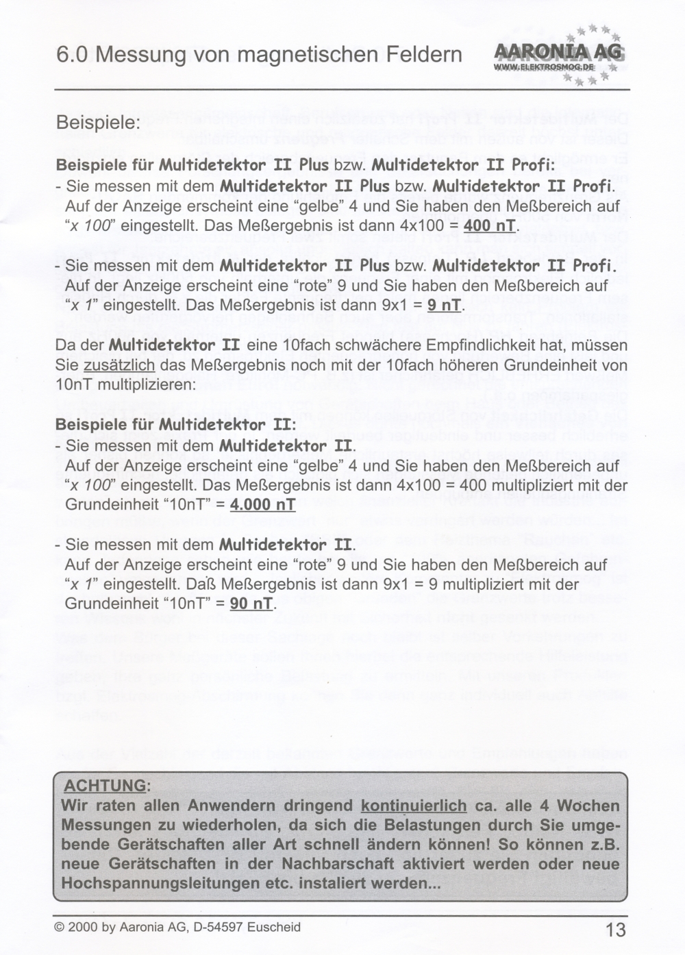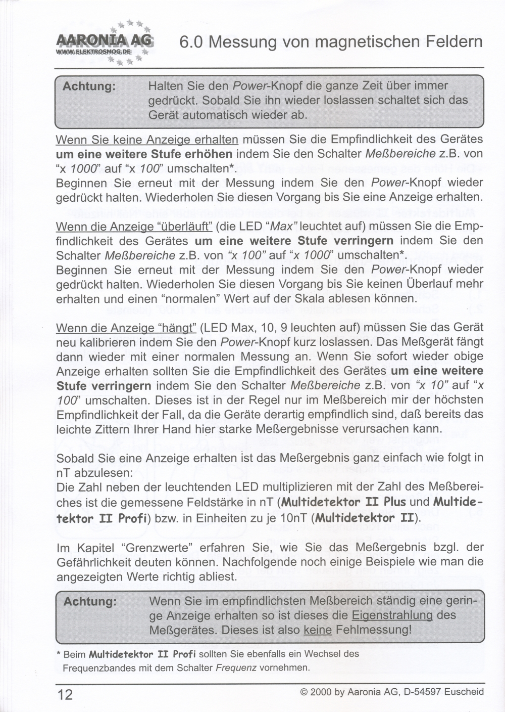 Messung magnetischer Felder in 4 Messbereichen: 1-10 nT; 10-100 nT; 100-1000 nT; 1000-10000 nT; beste Auflösung: 1 nT;
