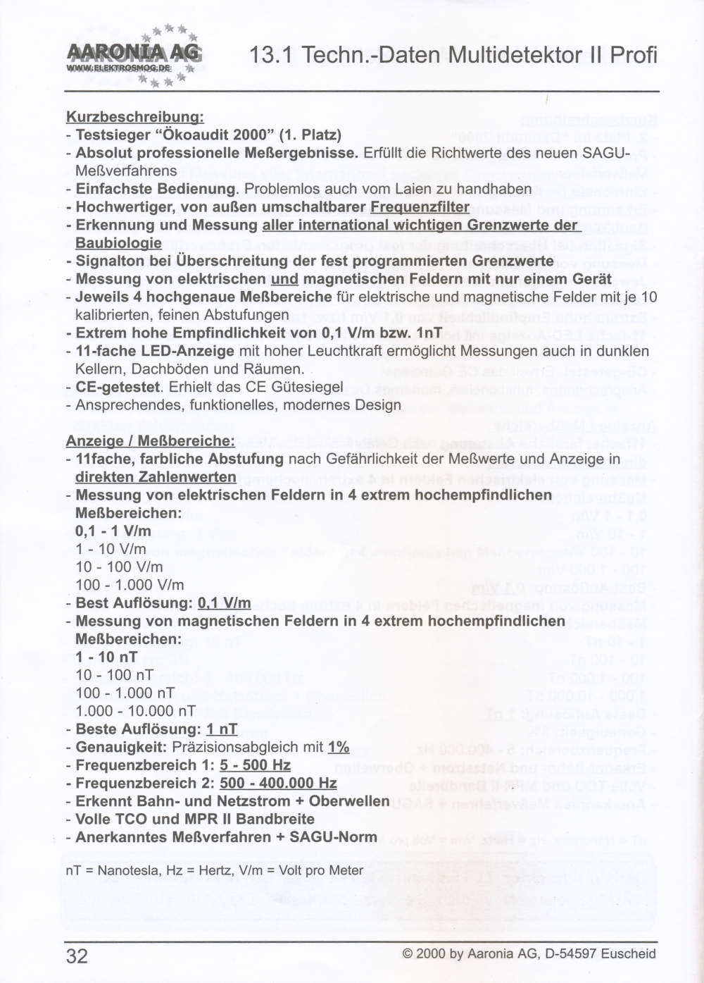 Measurement of electric fields in 4 testing ranges: 0,1-1 V/m; 1-10 V/m; 10-100 V/m; 100-1000 V/m; best resolution: 0,1 V/m;