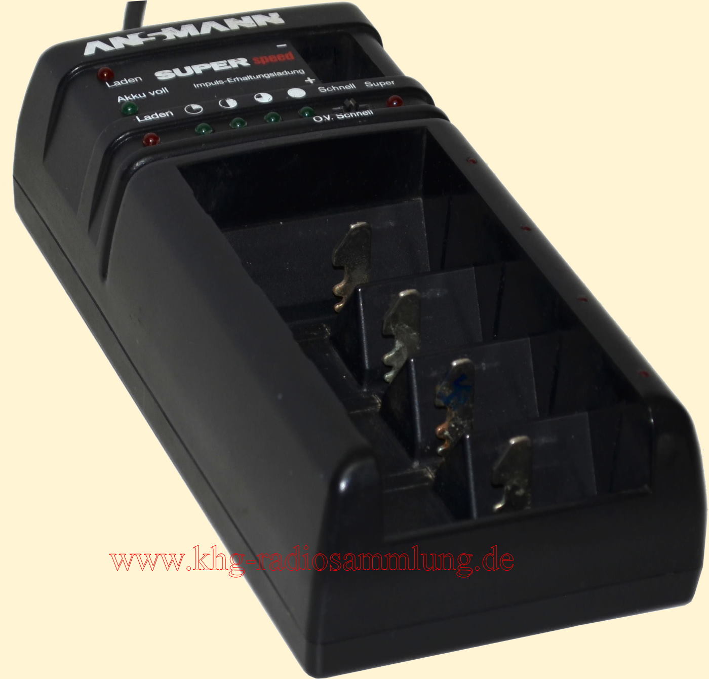 4 slots for rechargeable batteries in the sizes Mono (D), Baby (C), Mignon (AA) Micro (AAA); connection for 9 V batteries