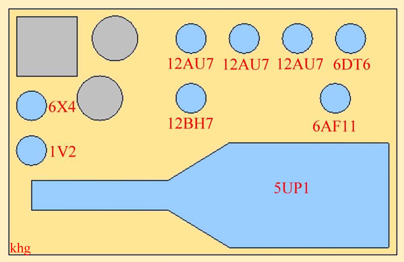 6AF11, 12BH7, 6DT6, 12AU7, 12AU7, 12AU7, 6X4, 1V2, 5UP1