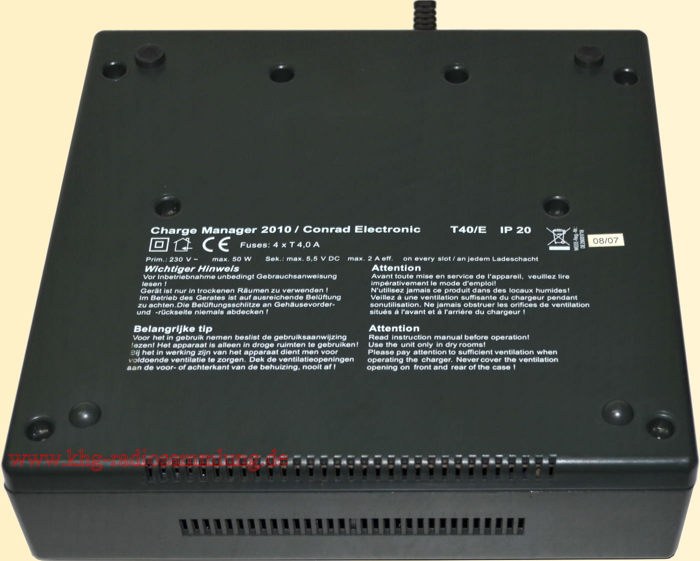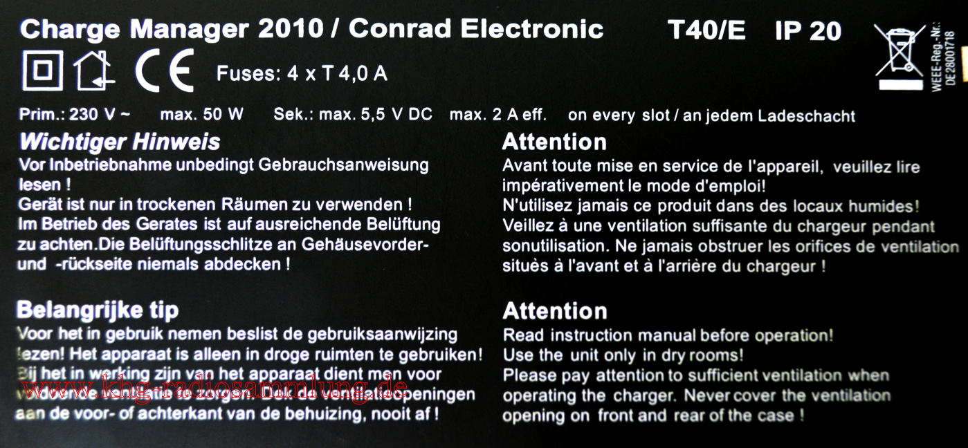 4 slots for rechargeable batteries (NiCd, NiMH) in the sizes Mono, Baby, Mignon (AA) Micro (AAA)