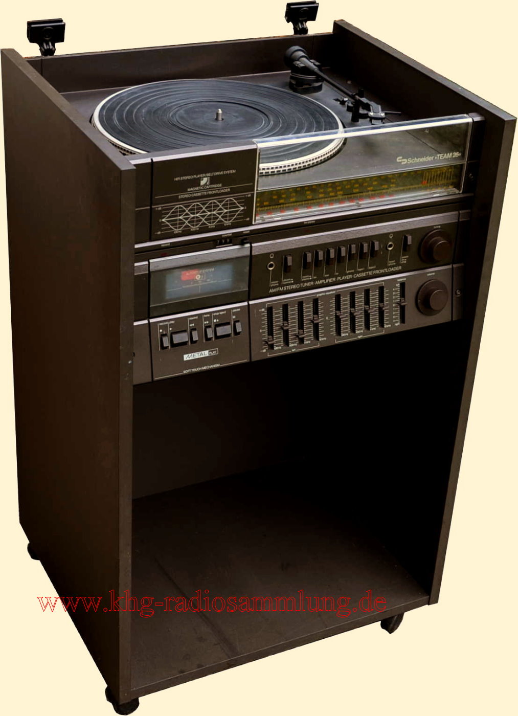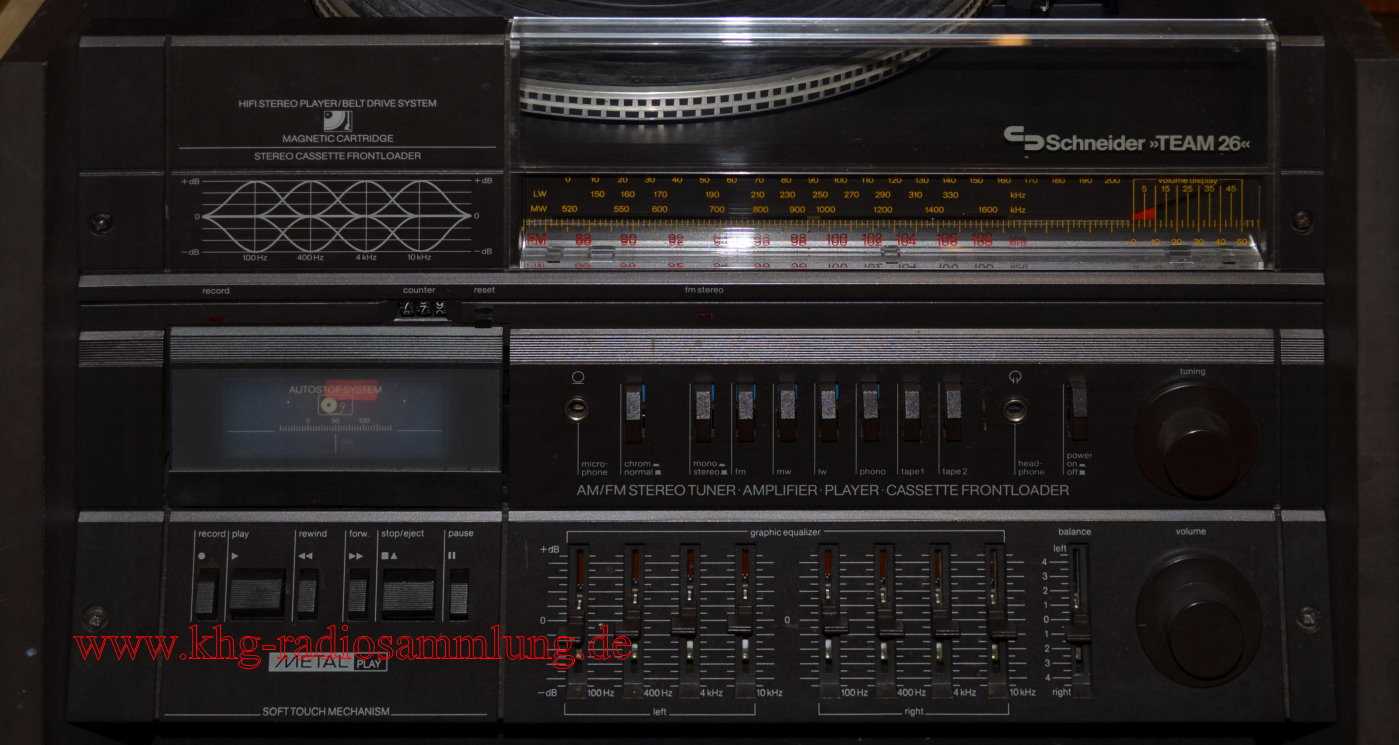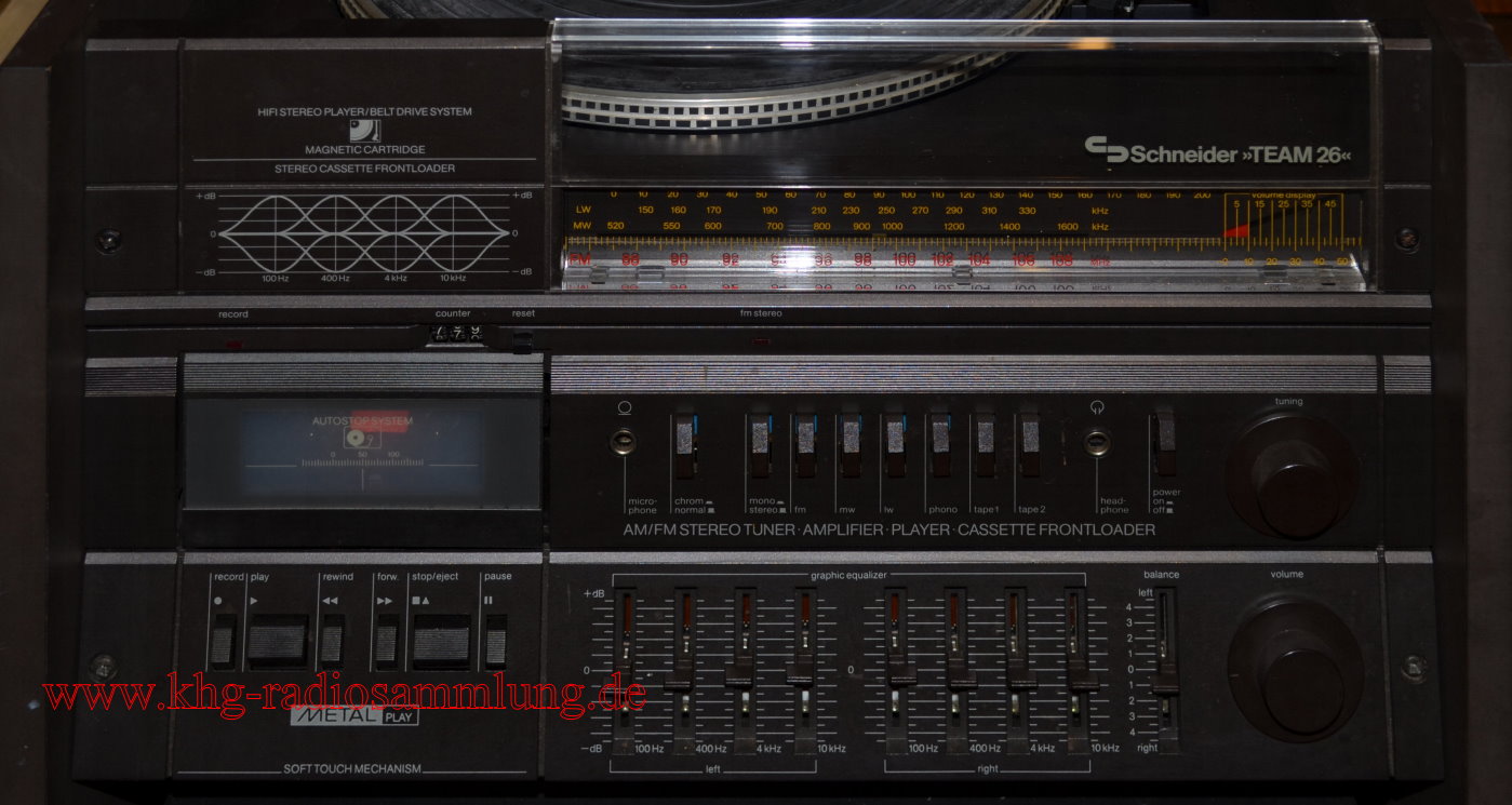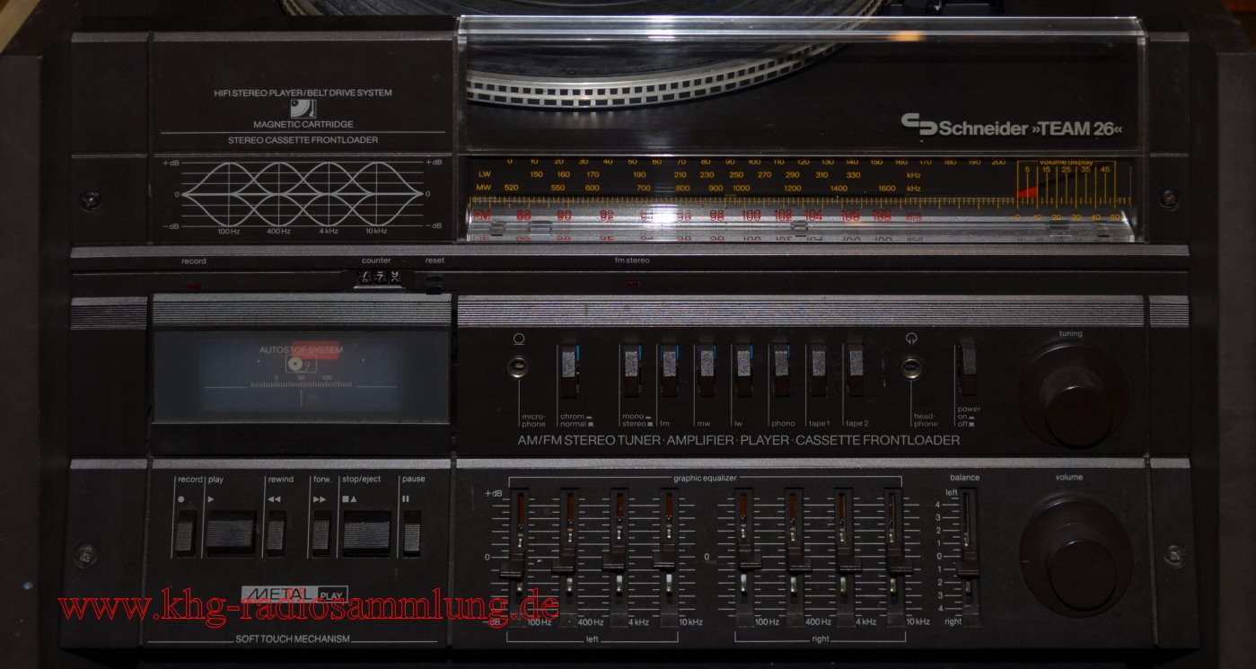 Components: Schneider AM/FM Stereotuner, Amplifier and Graphic Equalizer R260, Stereo Cassette Frontloader FLS 138, Hifi Stereo Player, Belt Drive System SBD 65