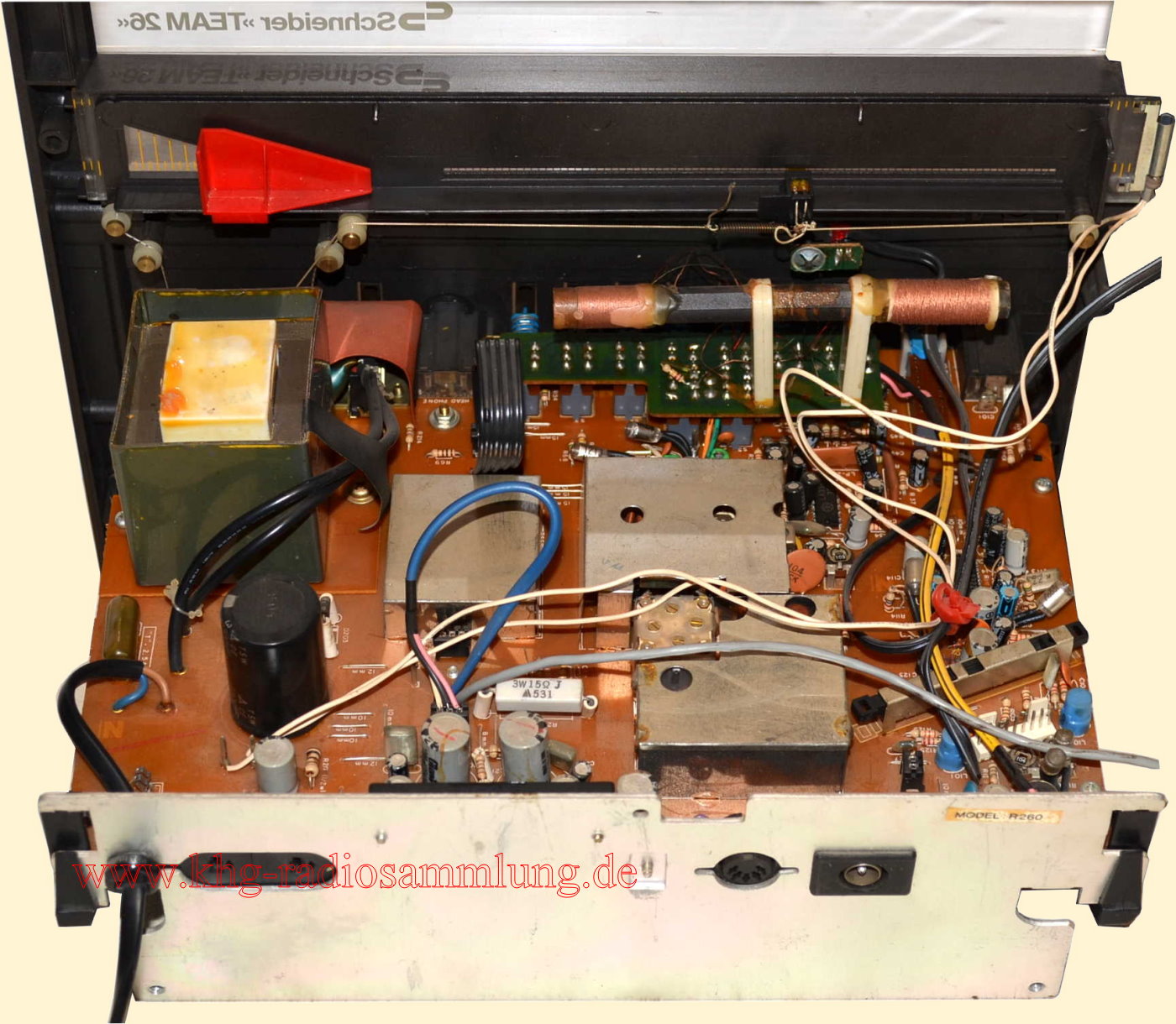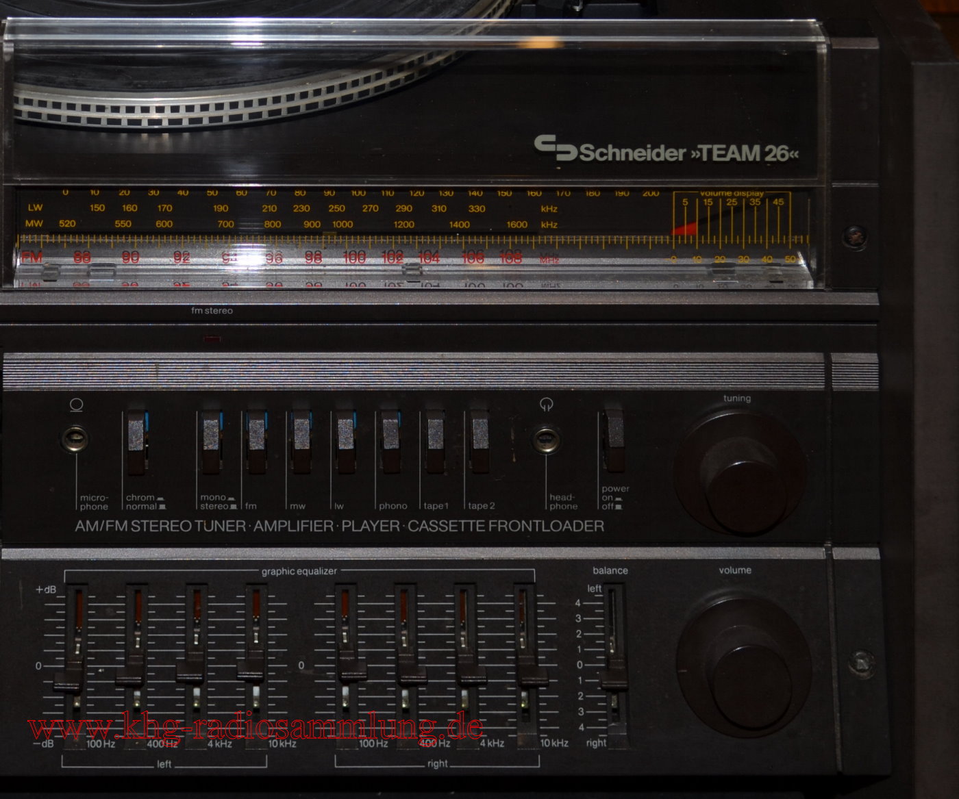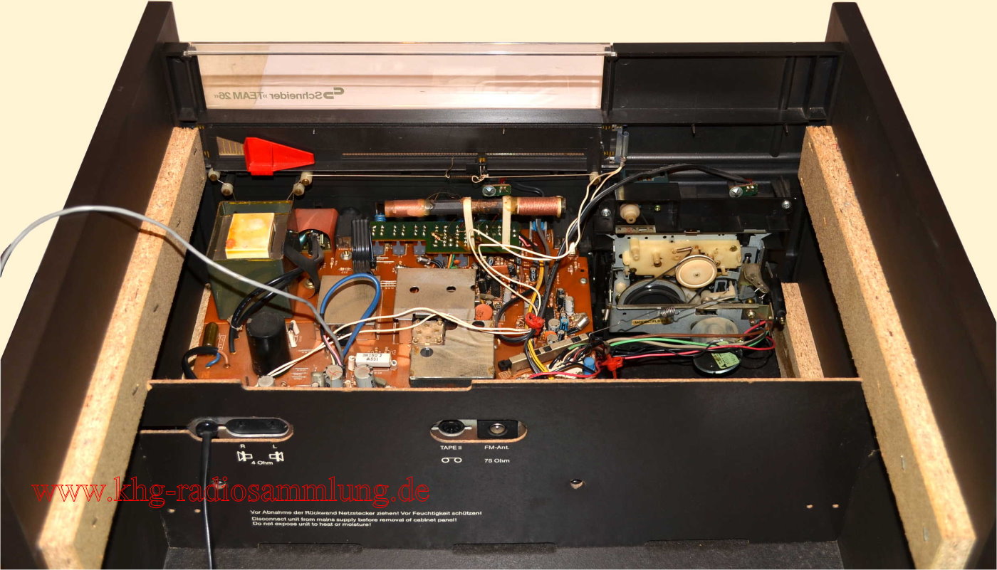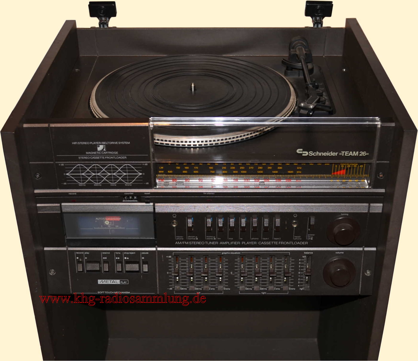 Components: Schneider AM/FM Stereotuner, Amplifier and Graphic Equalizer R260, Stereo Cassette Frontloader FLS 138, Hifi Stereo Player, Belt Drive System SBD 65