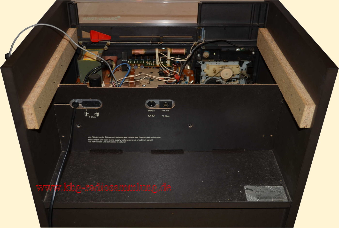 Componentes: Schneider AM/FM Stereotuner, Amplifier and Graphic Equalizer R260, Stereo Cassette Frontloader FLS 138, Hifi Stereo Player, Belt Drive System SBD 65