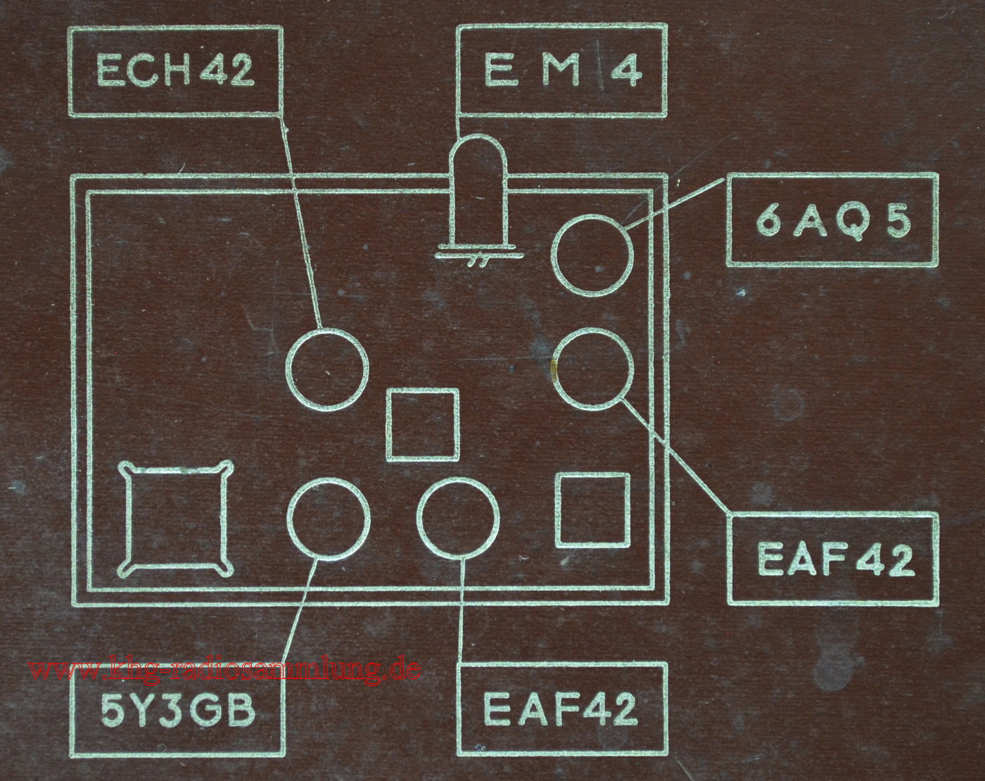 Röhren im Gerät / Tubes in the device / Lampes dans l'appareil / Tubos en el dispositivo: ECH42, EAF42, EAF42, 6AQ5, 5Y3GB, EM34